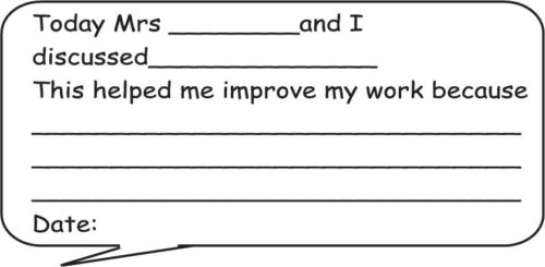 Feedback stamp: "Today... Mrs ... and I ... discussed ... This helped me improve my work because ...Date:..."